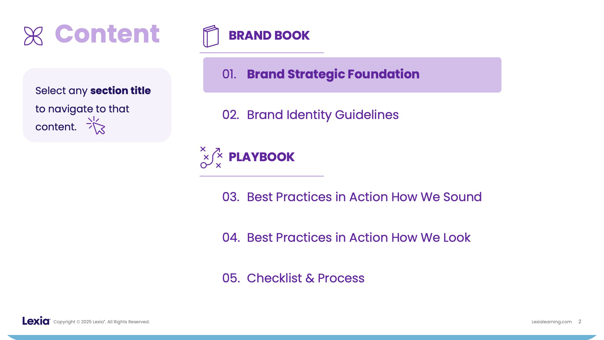 Developed a 100-page brand book providing both strategic direction and practical application: brand positioning and messaging architecture, complete visual identity system with precise specifications, application guidelines across all channels, before/after examples and common mistakes, template library overview, and governance guidance on when to DIY versus request support.