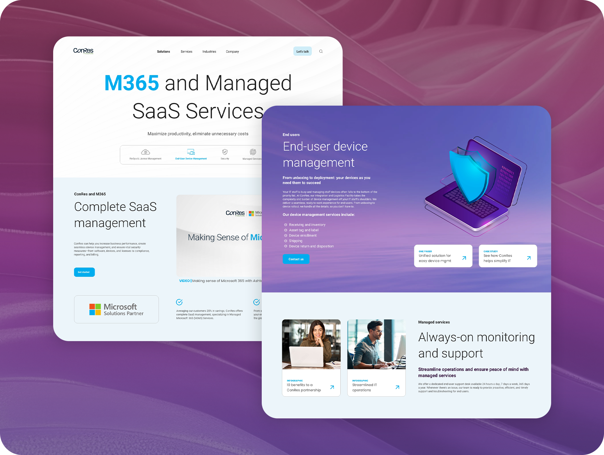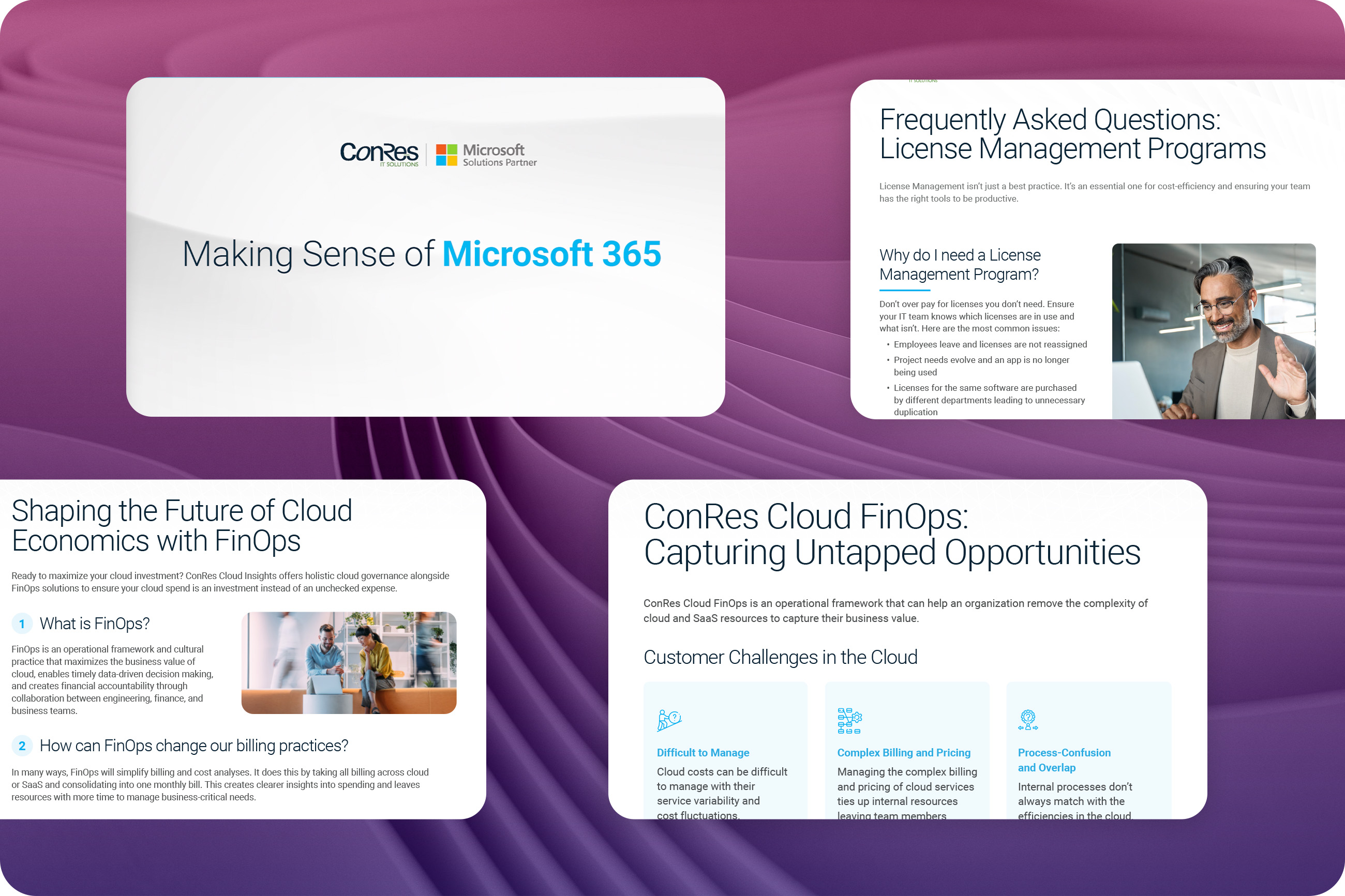 I developed an integrated campaign centered on the insight that companies overspend on M365 by 35% while underutilizing its capabilities—positioning ConRes as the expert partner who delivers "complete SaaS management." Beyond the campaign itself, I created a comprehensive library of 11 sales enablement assets spanning infographics, one-pagers, guides, FAQs, and case studies that would serve as both lead magnets and sales tools. I also produced and edited two educational videos featuring ConRes subject matter experts that brought complex technical topics to life. The landing page served as the conversion hub where all assets lived, supported by email nurture, paid media, and social amplification—creating a complete content ecosystem that educated, engaged, and converted.